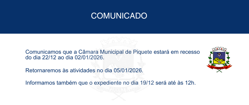 CÂMARA DE PIQUETE REALIZA 19ª SESSÃO ORDINÁRIA e 1ª SESSÃO EXTRAORDINÁRIA DE 2025